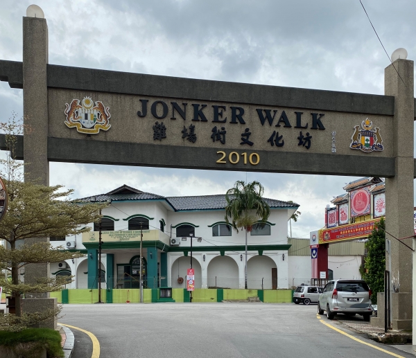 A Malacca, l’entrée de la rue touristique « Jonker Walk » et vue sur le futur hôtel de JY/K (20 décembre 2020).