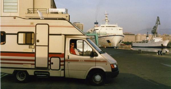 Arrivée au port de Naples dans le camping-car (Jean-Yves et Nicolas dans le camping-car, août 1987).