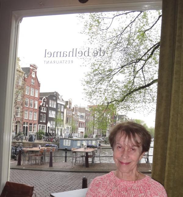 Simone au restaurant qui est à côté de notre hôtel, lequel est visible derrière (Amsterdam, avril 2014).