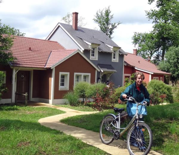 Simone sort son vélo de notre cottage (le gris, au centre) à Center Parcs Lac d’Aillette (juin 2012).