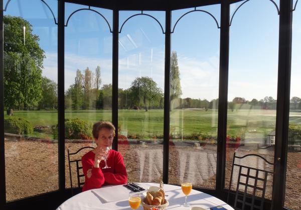 Simone prend son petit déjeuner dans la verrière du château des 7 tours (13 avril 2012, Vallée des Rois).