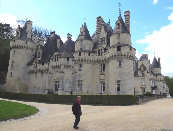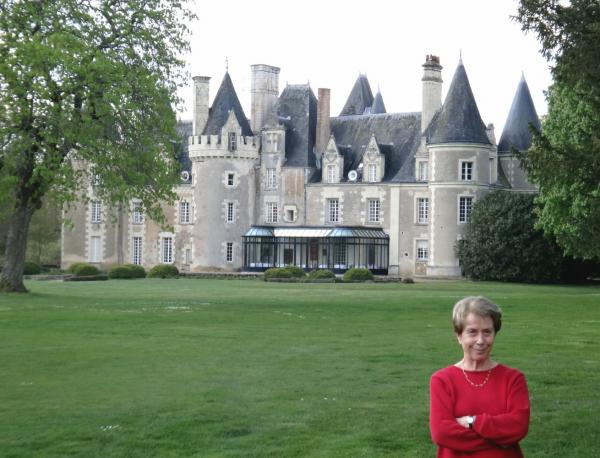 Simone, devant le château des 7 tours dans lequel nous avons logé (13 avril 2012, Vallée des Rois, France).)
