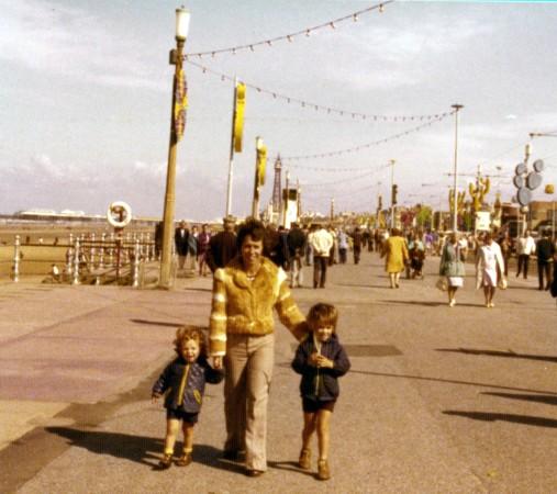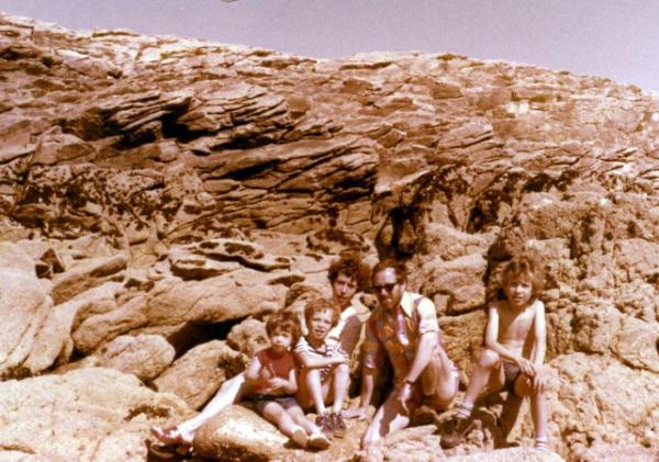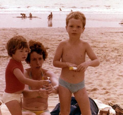 Simone aide Nicolas et Stéphane à se mettre de la crème contre le soleil sur la plage de La Faute sur Mer (Vendée, été 1979).