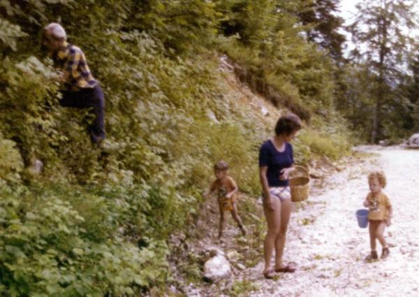 Jean-Yves, Nicolas et Simone ramassent des fraises sauvages avec Bon-Papa dans la montagne près du châlet de Lépin-le-Lac (été 1975).