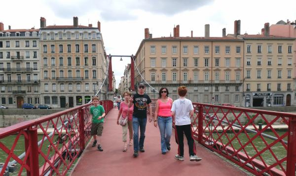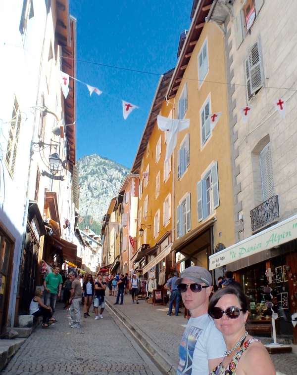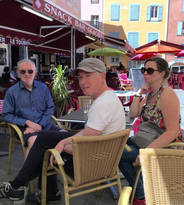 Serge, Nicolas et Sonya boivent « un pot » dans le centre du vieux Briançon (Place d’armes, 14 août 2016).