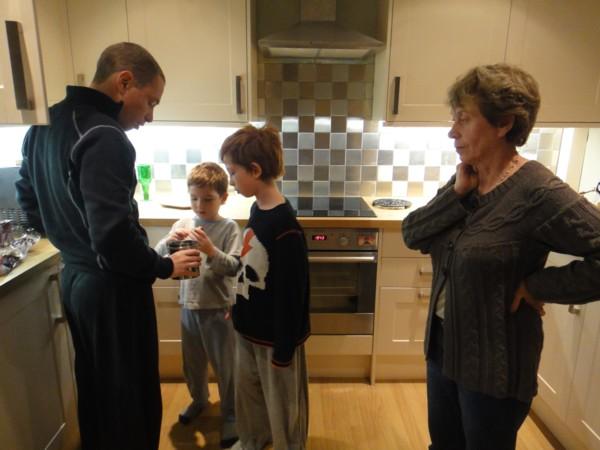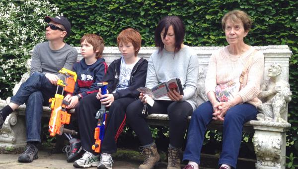Nicolas, Sonya, Julien et Daniel dans le « hot pool » de Center Parcs (Elveden Forest, East Anglia, UK, avril 2011).