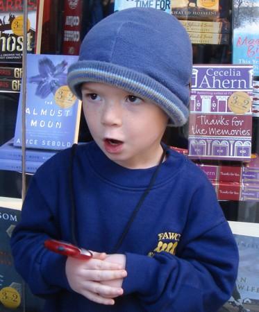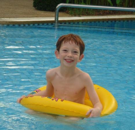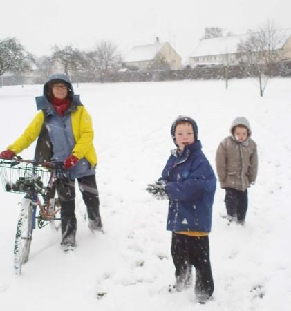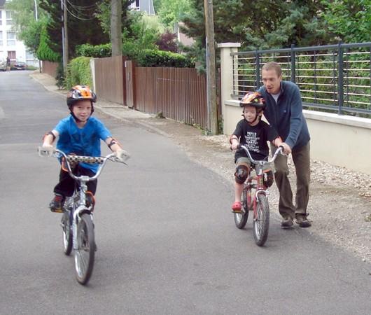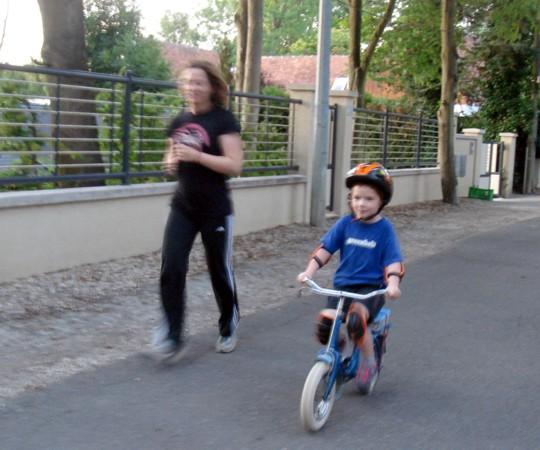 Daniel sait aller vite en vélo, pendant que sa Maman courre à côté de lui (Clos-St-Martin, août 2009).