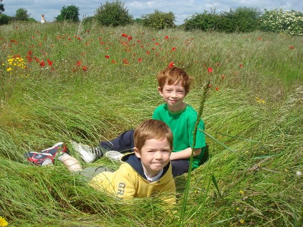 Julien et Daniel sont allonges dans le champ de cocquelicots derriere la maison a Trumpington (26 mai 2009)