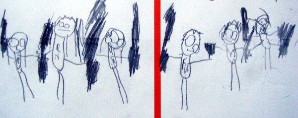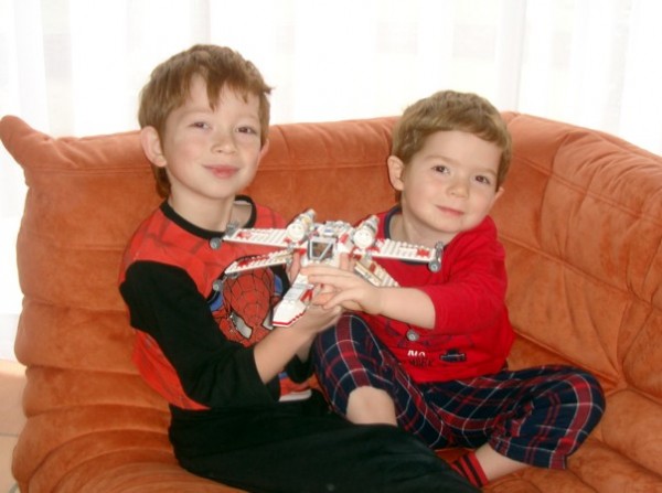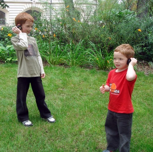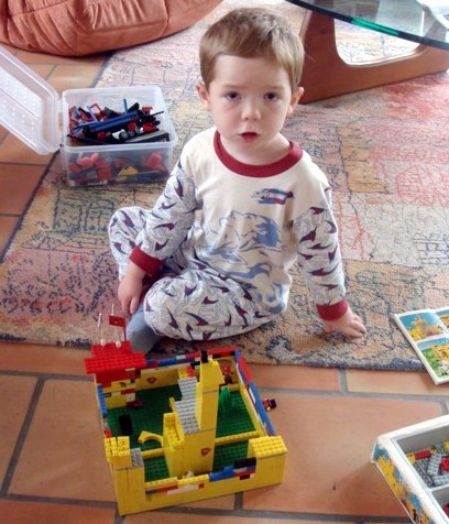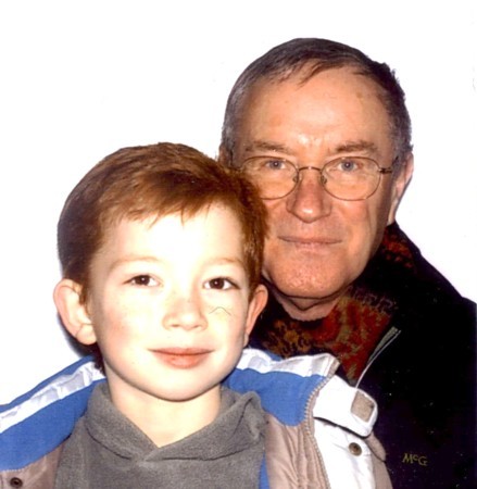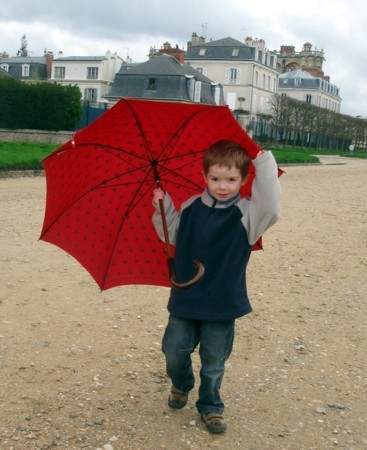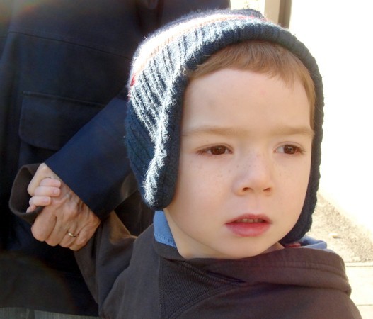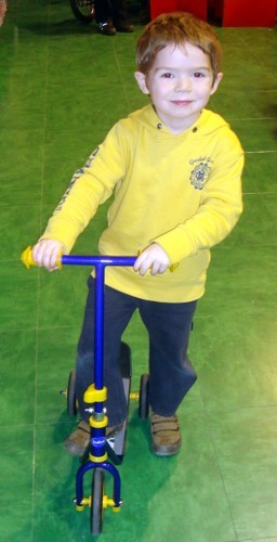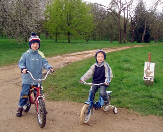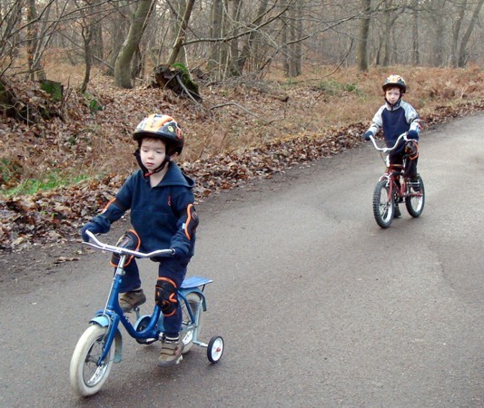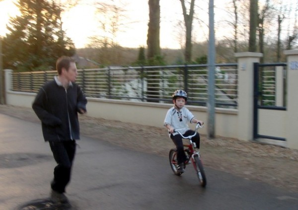 Julien apprend à faire du vélo sans les deux roues arrière stabilisatrices avec Nicolas qui courre à côté de lui (L’Etang la Ville, Noël 2007).