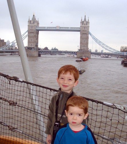 Daniel et Julien sont sur le bateau de la deuxième guerre mondiale HMS Belfast (Londres, octobre 2007).