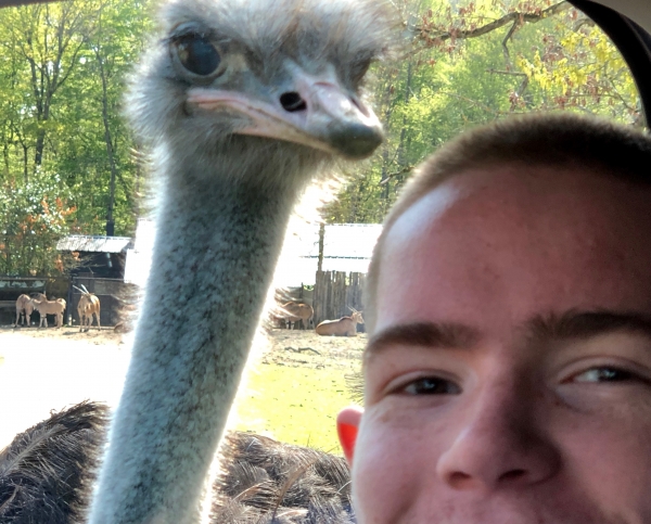 Rencontre (dans la voiture) avec une autruche ! Aujourd’hui, mercredi 17 avril 2019, nous avons été visiter le parc animalier de Thoiry avec Daniel !