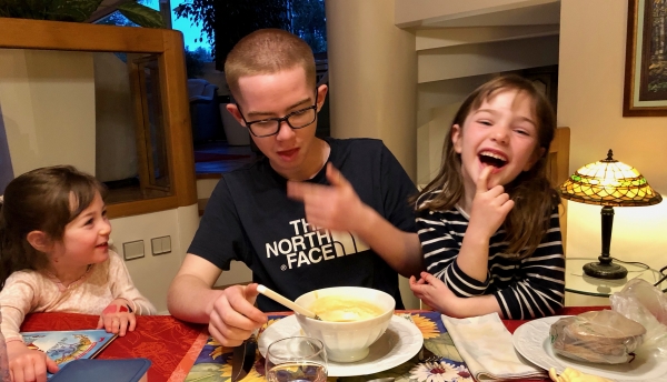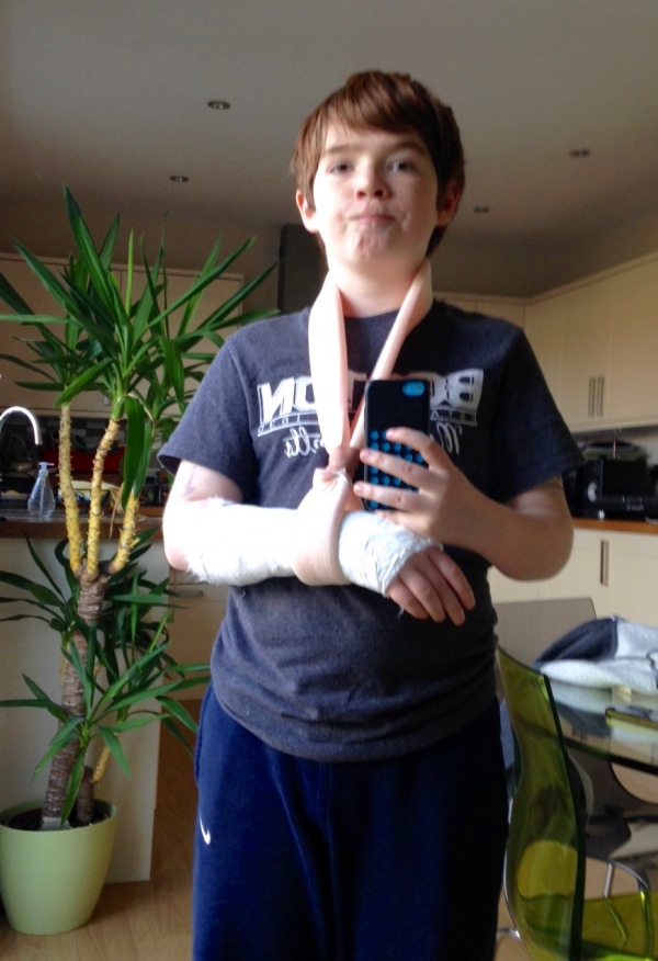 daniel a le bras gauche dans le plâtre après s’être cassé le poignet à l’école lors d’une séance de gym (16 mars 2016).