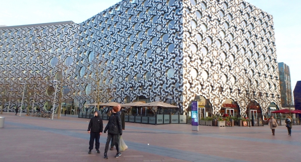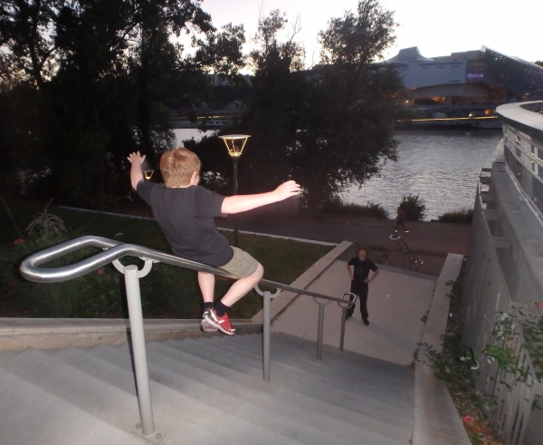Julien s’amuse à descendre sur une rampe d’escalier près du musée de la Confluence (Lyon, 30 août 2015).