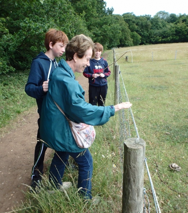 Simone, Daniel et Julien touchent le fil électrique d’une clôture (Wandlebury Country Park, Cambridgeshire, 28 juin 2015) !