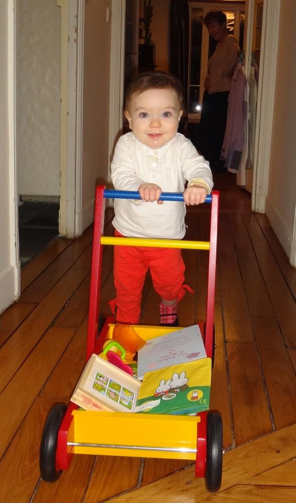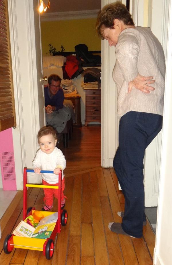Fièrement, la petite Joséphine pousse son chariot, devant les yeux admiratifs de Stéphane et Simone (16 janvier 2014).