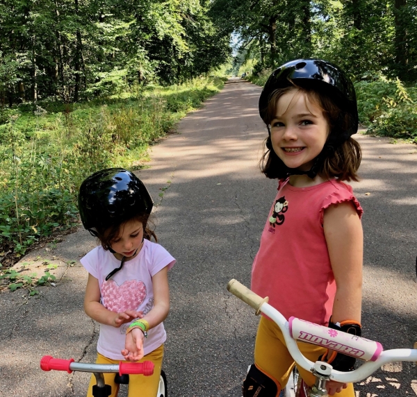Eléonore & Joséphine font du vélo et de la draisienne dans la forêt de l’Etang la Ville (4 septembre 2019).