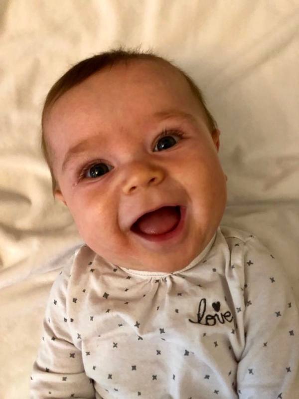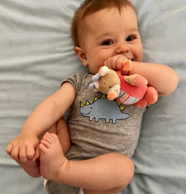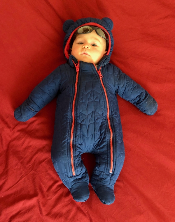 Raphaël (4 mois) sur le lit de la chambre de Nicolas à l’Etang la Ville (14 avril 2019, il fait froid dehors) !