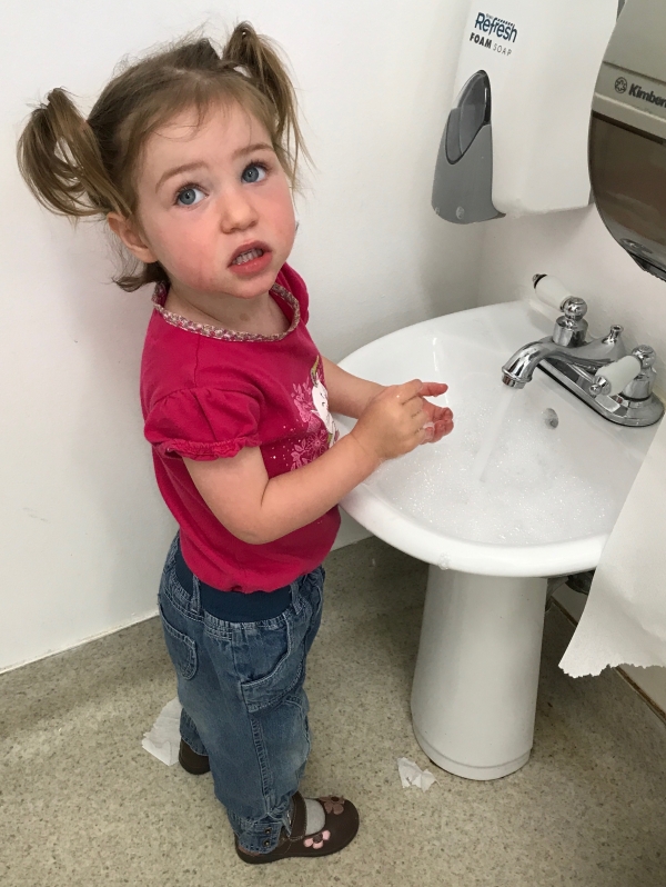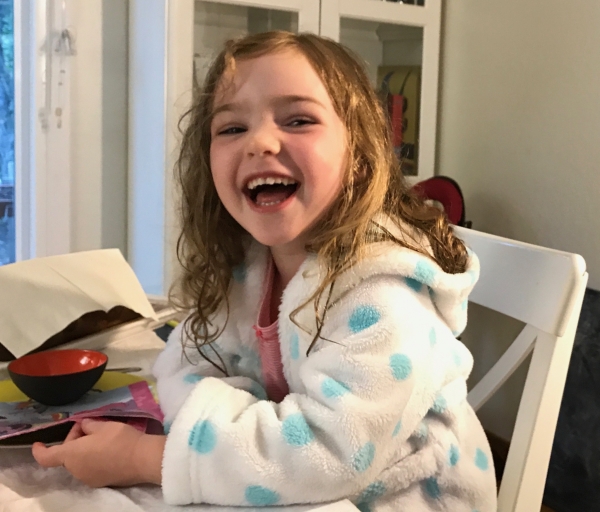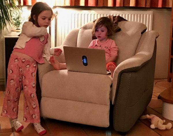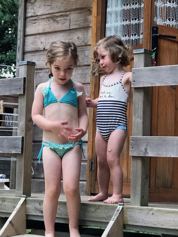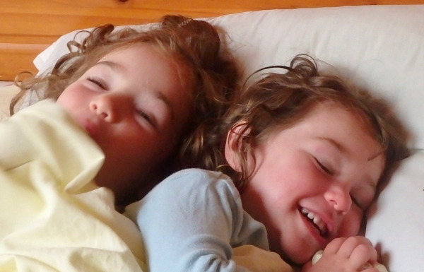 Joséphine et Eléonore font semblant de dormir dans notre lit (Ecurie du Marais, Vendée, 4 août 2017).