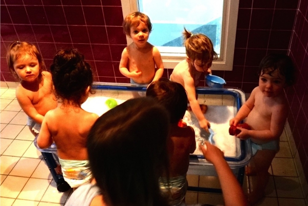 Stéphane tient précieusement Eléonore dans ses bras à la piscine de Center Parcs « les bois francs » (Normandie, 6 juin 2015).