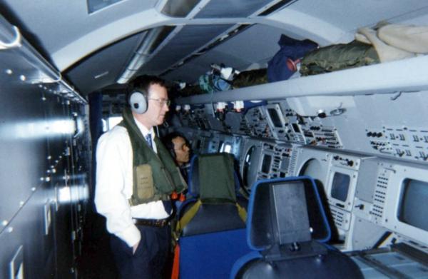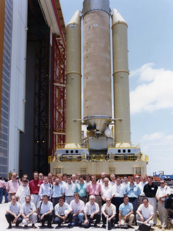 Avec l’équipe du CNES devant Ariane 5 en construction (Kourou, Guyane Française, 1995). Serge est le sixième debout à gauche.
