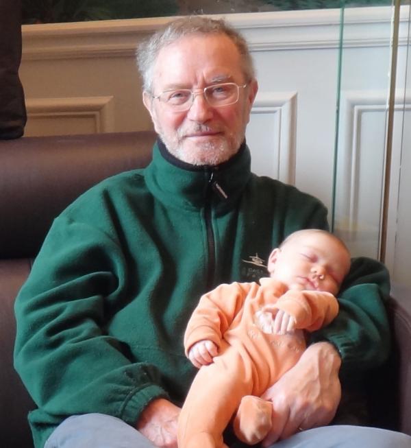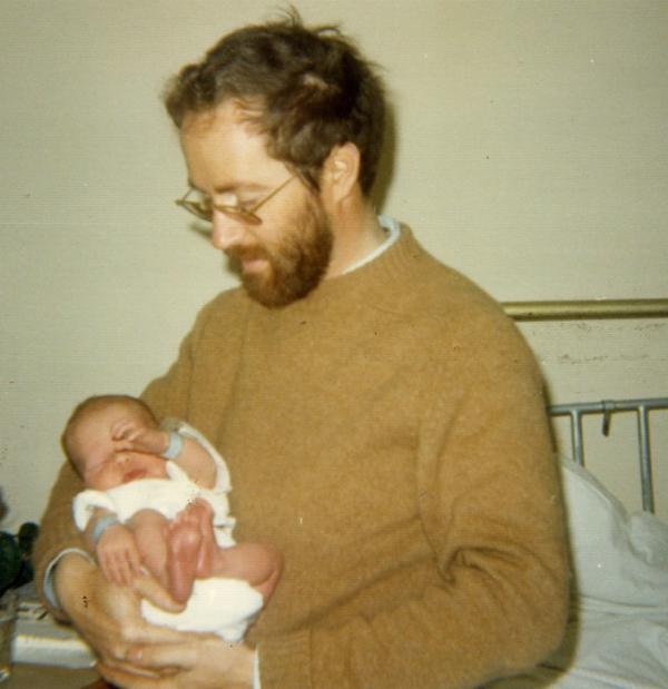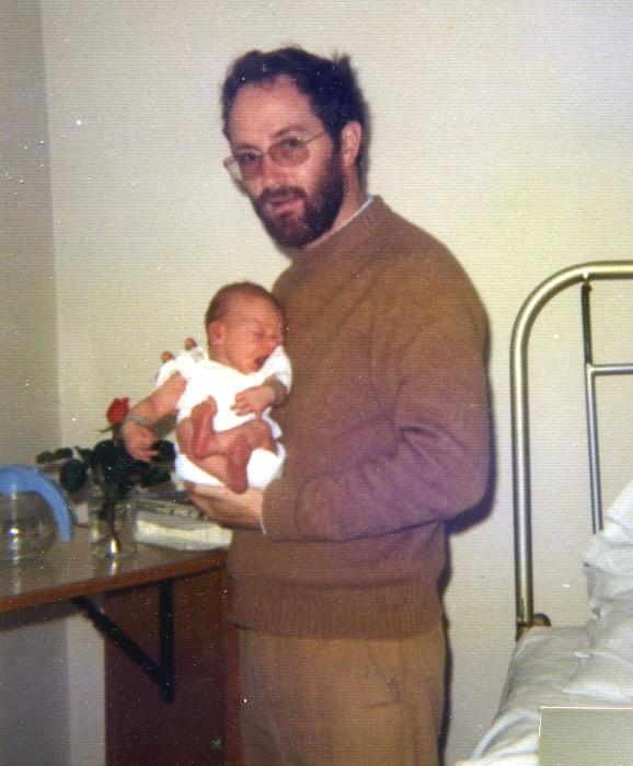 Bébé Nicolas a quelques jours et est dans les bras de son Papa (Glenroyd Hospital, Blackpool, juin 1973).