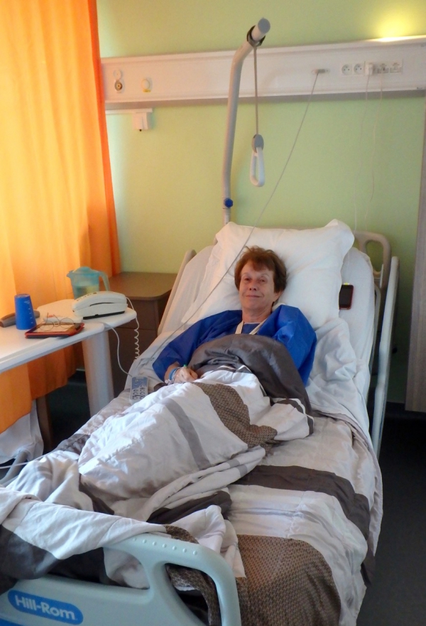 Simone sur son lit de la Clinique de l’Europe le soir où elle a cassé son poignet (29 septembre 2015).