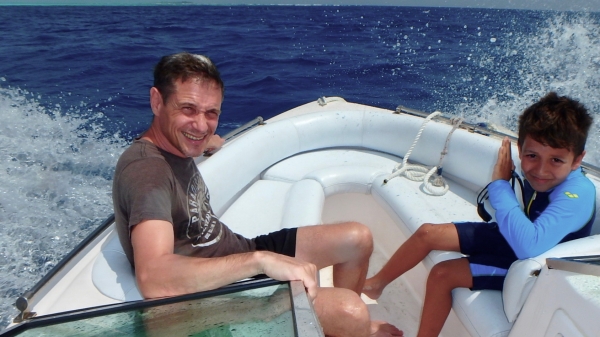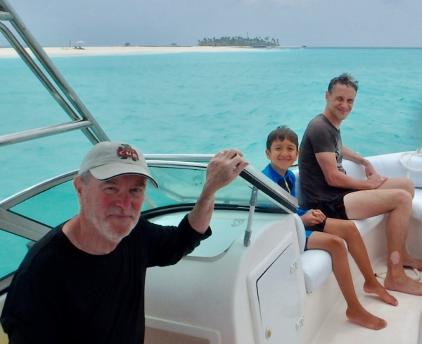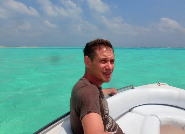 Jean-Yves sur le bateau qui nous emmène au banc de sable, visible au fond de la photo (Maldives, 12 mars 2018).