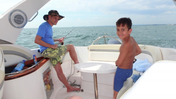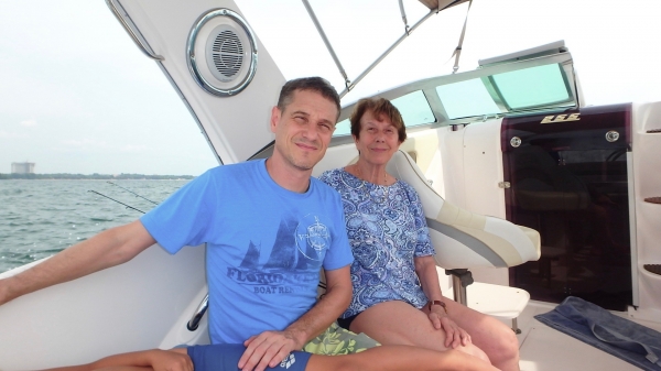 Jean-Yves & Sylvain sur le bateau qui nous ramène sur notre atoll, de retour du banc de sable (12 mars 2018).