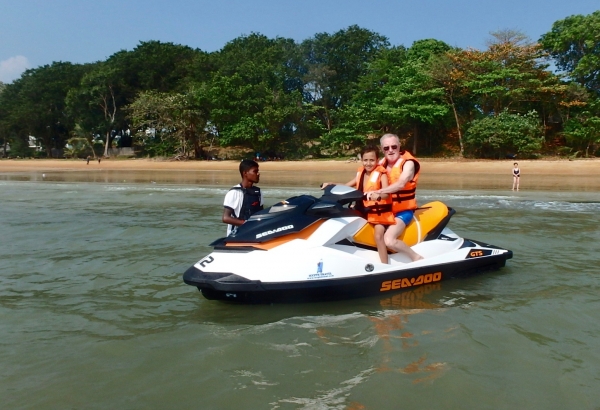 Sylvain et Serge font du jetski sur la plage en face du terrain de JY/K à Port Dickson (noter en arrière plan, Simone debout sur la plage, 18 février 2018).