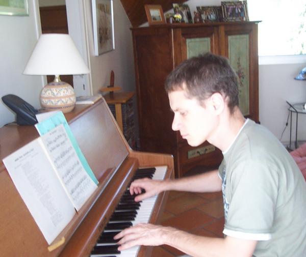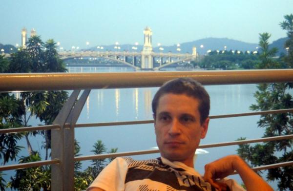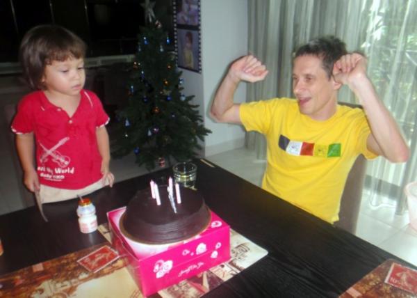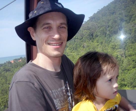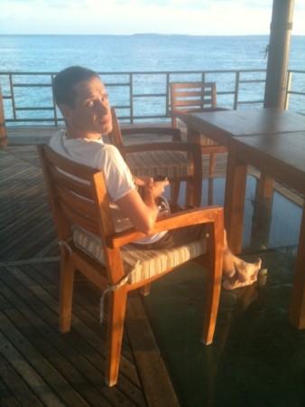 Jean-Yves, sur la terrasse en bois de leur hôtel (les pieds dans l’eau) aux Maldives en février 2011.