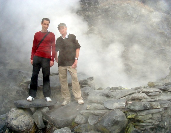 Jean-Yves et son père dans l’un des cratères du Tangkuban Prahu, volcan situé au nord de Bandung (Indonésie, août 2008).