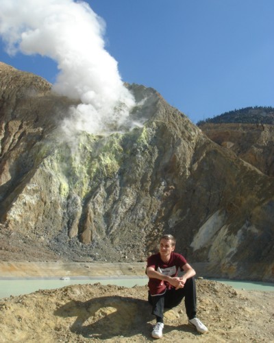 Jean-Yves se repose près de l’un des cratères du Gunung Papandayan (volcan au sud-est de Bandung, Indonésie, août 2008).