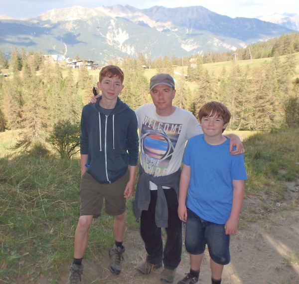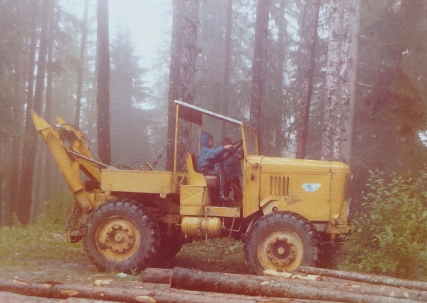 Jean-Yves (7 ans) et Nicolas (4 ans) conduisent un énorme tracteur dans la forêt près de Longefoy-sur-Aime (été 1977).