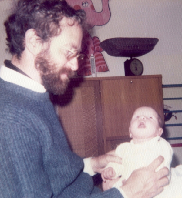 Nicolas, quelques semaines après sa naissance, dans les bras de son père (été 1973, Ansdell, Lancashire, England).