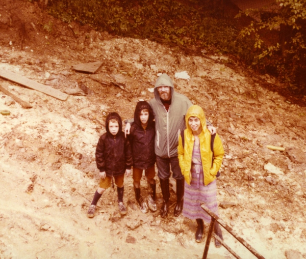 Nicolas, Jean-Yves, Simone et Serge sur notre terrain pendant la construction de notre maison (printemps 1981, L’Étang la Ville).