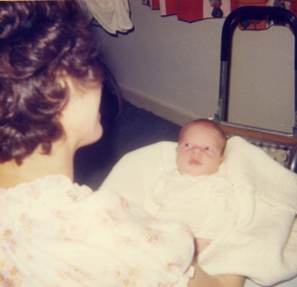 Nicolas, quelques semaines après sa naissance, dans les bras de sa mère (été 1973, Ansdell, Lancashire, England).