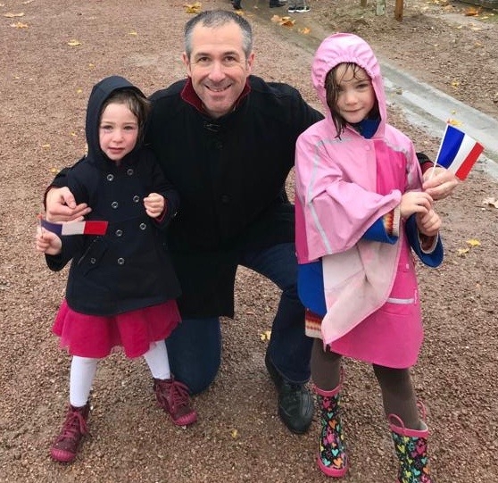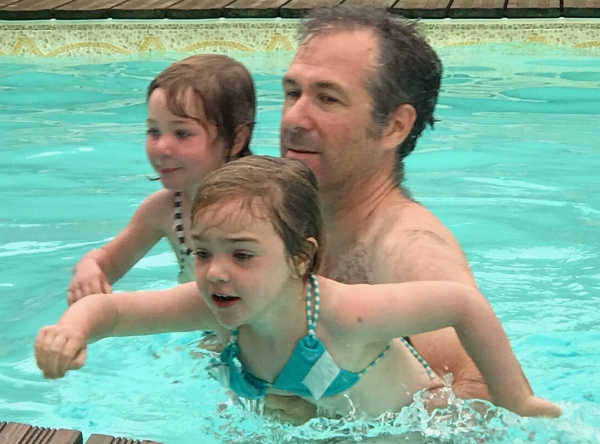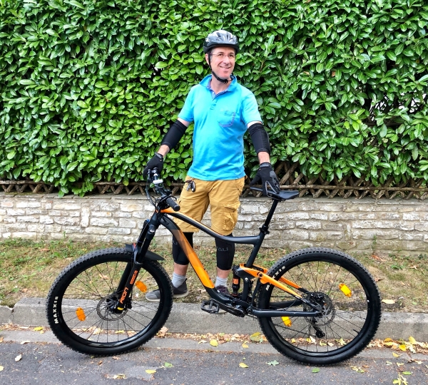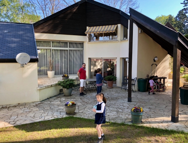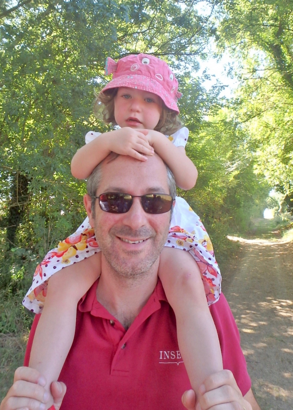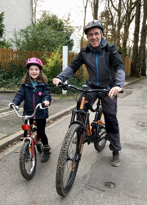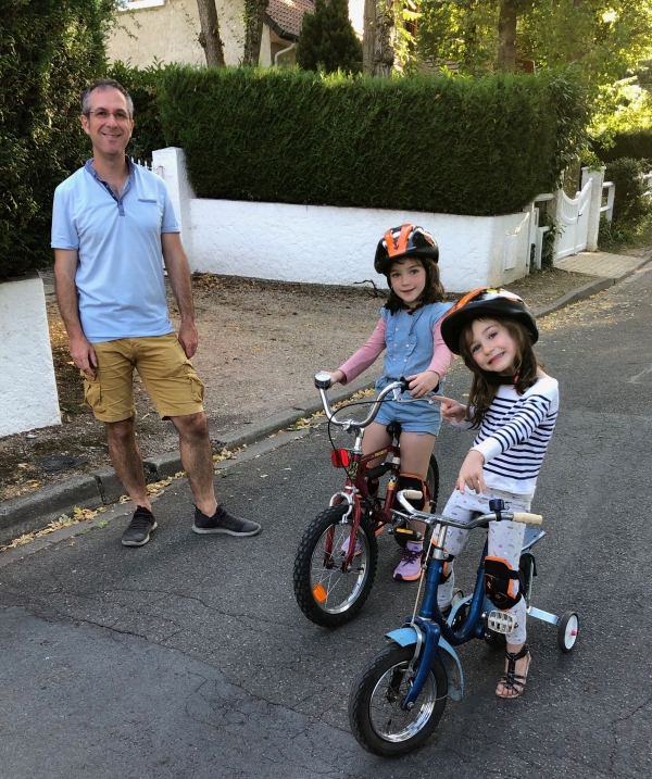 Sous la surveillance de leur Papa, Joséphine et Eléonore font du vélo sur le chemin du Clos St Martin, toutes les deux utilisent les vélos de leur Papa quand il avait leur âge ! (15 septembre 2019).
