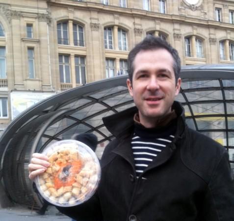 Stéphane montre les Balaklavas qu’il a ramené pour nous de Jordanie, malheureusement ils ont moisi ! (janvier 2011, St Lazare).