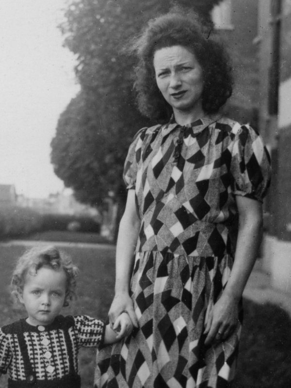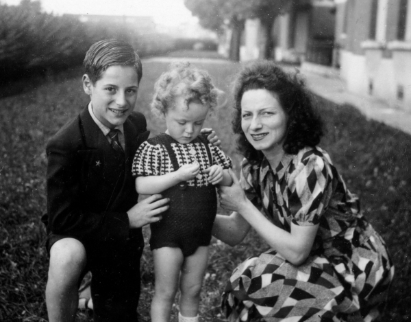 Guy (12 ans), Serge (1 an 1/2) et leur Maman sur la pelouse derrière l’appartement de Suresnes (1943).