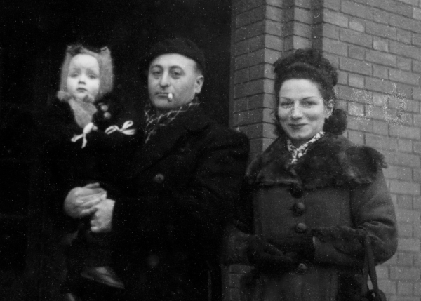 Serge (1 an 1/2) avec ses parents devant l’entrée de notre immeuble (25 rue Kellog, 92150, Suresnes) en 1943.