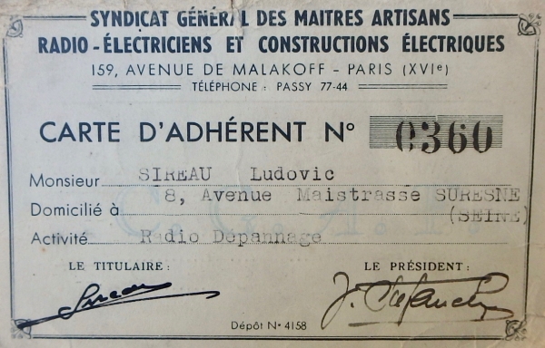 Ludovic Sireau (le père de Serge) a été toute sa vie passionné de radio (carte d’adhérent au syndicat des artisans radio datée d’octobre 1946).