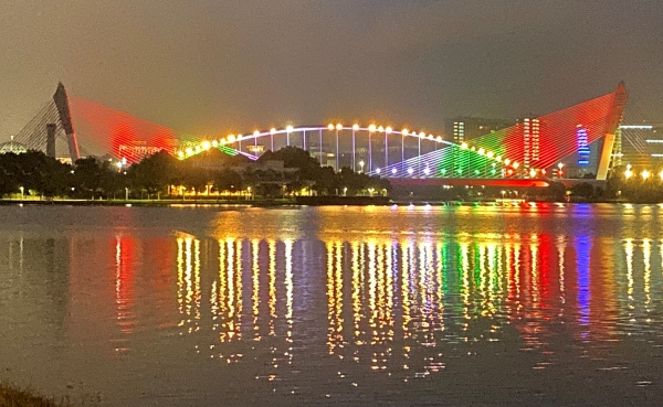 Vue du pont (illuminé la nuit) sur le lac de Putrajaya, en rantrant d’une promenade à vélo avec Sylvain (9 juin 2021).