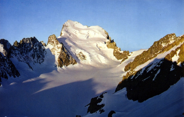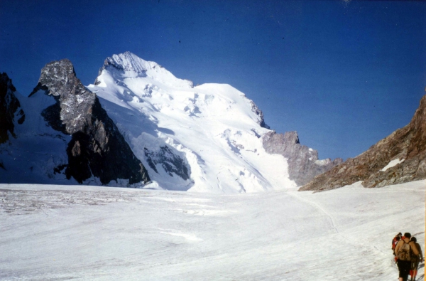 Après le refuge des Ecrins (3200 m) notre cordée avance vers les « Ecrins » (face nord : altitude 4103 mètres).