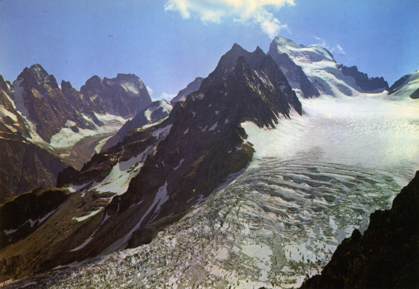 En août 1975 (il y a 40 ans !), Simone et Serge font une course en montagne dans la Vanoise (Glacier Blanc, altitude 3200 mètres). Vue des séracs, d’un couloir d’avalanche et du sommet (barre des Ecrins).