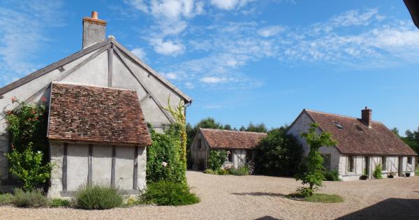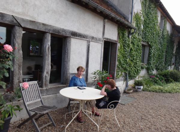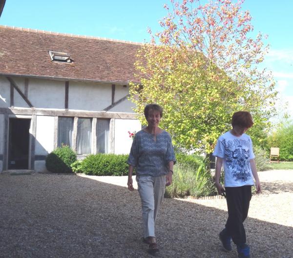 Simone et Julien sortent de notre maison de la Chambre d’Hôtes où nous logeons (Tour de Sologne, près de Chambord, 22 août 2013).