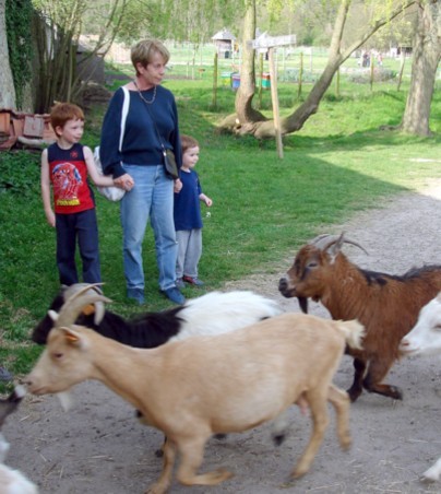 Daniel & Julien are a bit afraid of the goats (Gally’s farm near Versailles, April 1996) !
