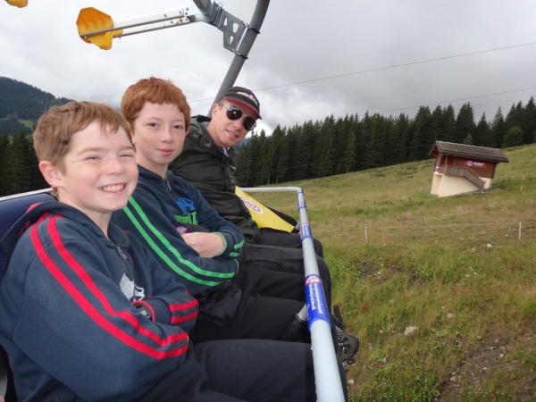 Daniel, Julien et Nicolas sur un télésiège qui va au Crêt du Loup (La Clusaz, 15 août 2014).