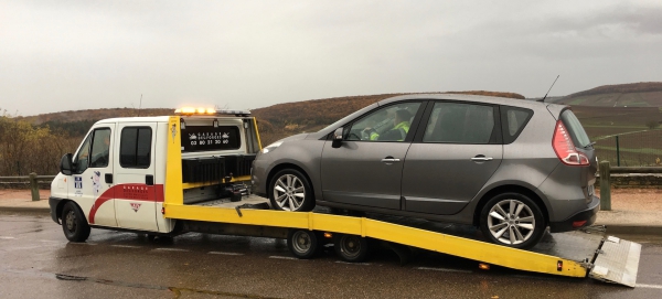 Our Renault Scénic on a tow truck, on the motorway one hour and a half north of Lyon (22nd November 2016).