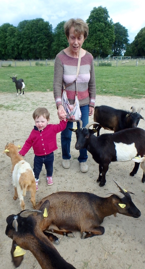 Éléonore is not at ease with the goats (Gally farm, near l’Étang la Ville, 14th July 2016).