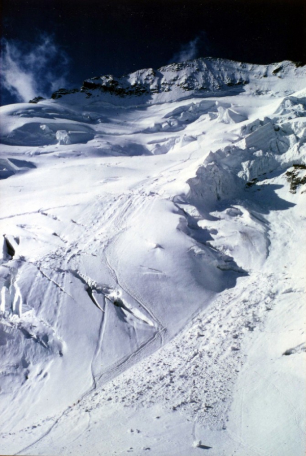 In August 1975 (40 year ago!), Simone & Serge trek and climb in the French Alps (« White Glacier », altitude 3200 mtrs). View of the seracs, of an avalanche corridor and the top of the « Ecrins » mountain.